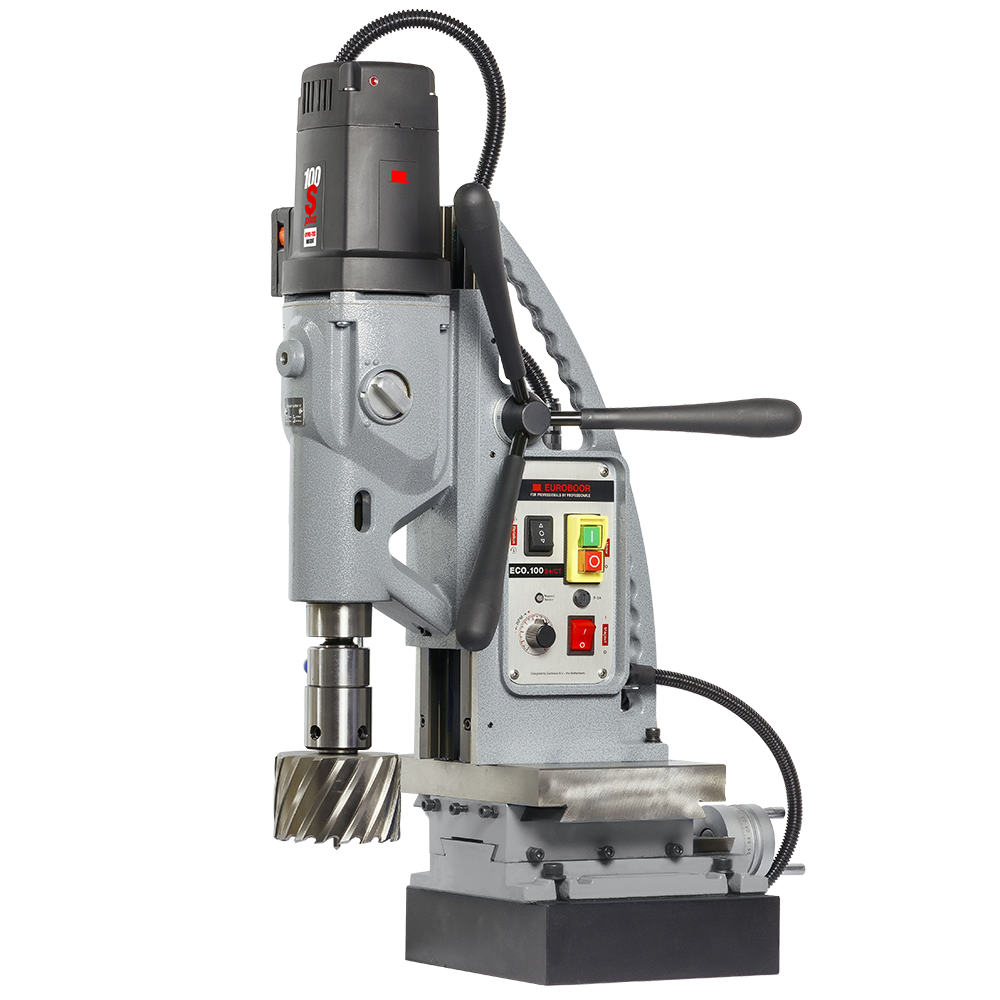 Euroboor ECO.100S+/CT magnetboremaskine er designet til at bore huller op til en diameter på 100 mm. Den er særligt velegnet til gevindskæring og mild fræsning. Maskinen har en række innovative funktioner, der gør den til en alsidig og pålidelig løsning til komplekse bore- og fræseopgaver.