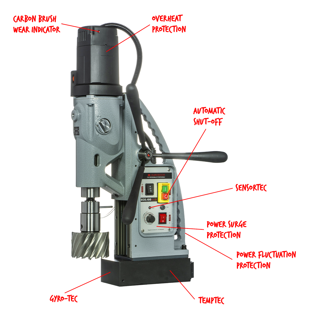 Den bærbare Euroboor ECO.100S+/TD magnetkerneboremaskine har en unik svingbase, som tillader magneten at rotere 30º i begge retninger og glide 15 – 20 mm frem og tilbage. Denne magnet boremaskine kan bore huller op til ø 100 mm og er særligt velegnet til gevindskæring. Den drager ikke kun fordel af en oliesmurt gearkasse, men også af innovativ elektronik, som tilbyder mere sikkerhed, reducerer risikoen for skader på maskinen, værktøjet og arbejdsemnet markant og beskytter brugeren i tilfælde af overdreven vibration eller pludselige forskydninger. Levetiden er betydeligt længere, og du undgår høje vedligeholdelsesomkostninger.