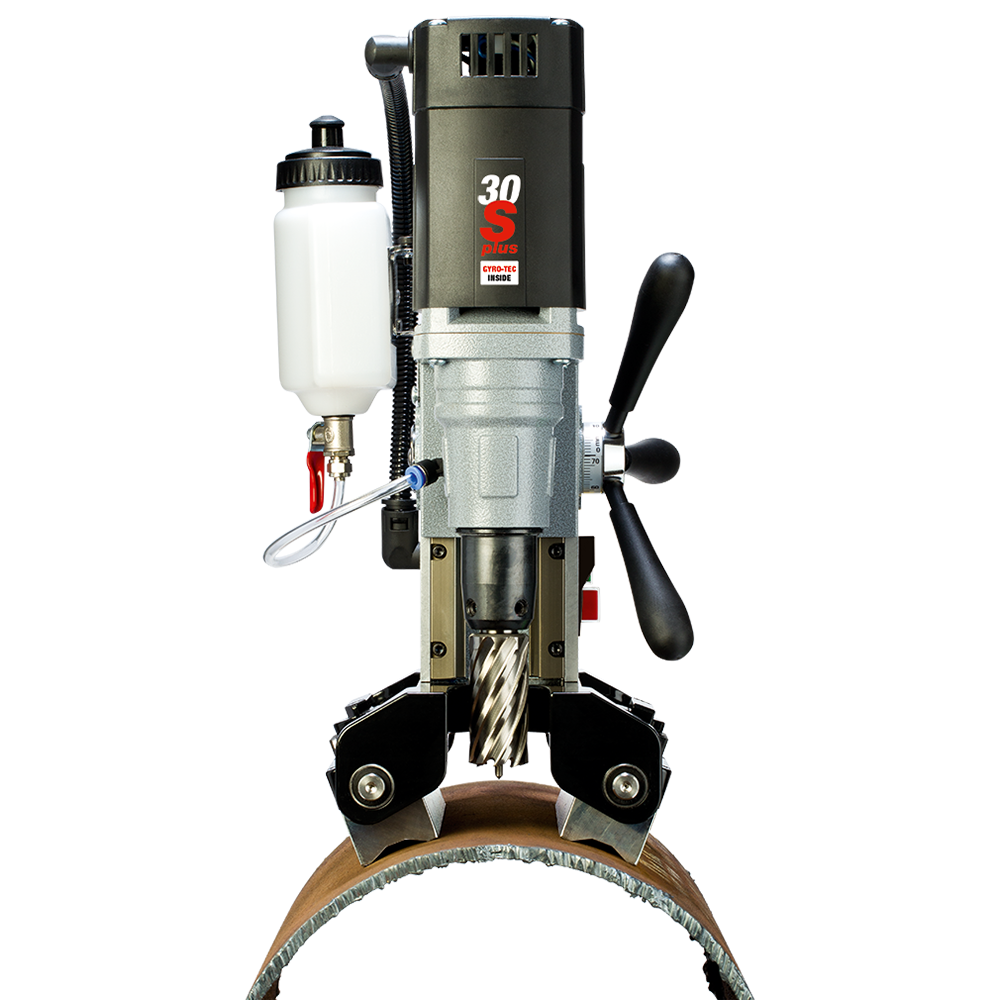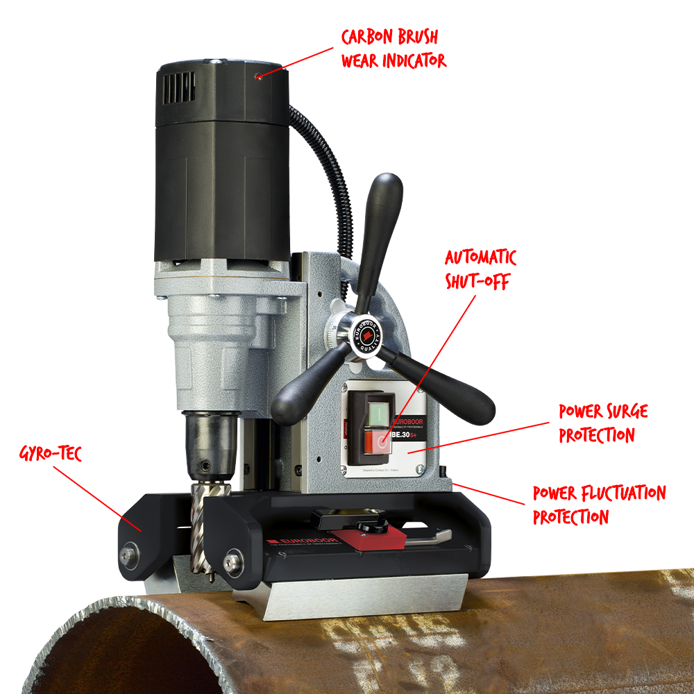 Euroboor TUBE.30S+ magnetkerneboremaskine er velegnet til både flade og rørformede materialer. TUBE.30S+ med den patenterede shallow-field magnetteknologi tilbyder en utrolig stærk greb, selv på stål så tyndt som 3 mm. Denne magnetkerneboremaskine justerer sig automatisk til enhver rørdiameter på ø 76,2 mm eller større. Magneten kræver ikke elektricitet, så al strøm går til motoren. Dette øger sikkerheden, da boremaskinen ikke frigøres fra materialet i tilfælde af et utilsigtet strømsvigt. Det olie-smurte gear og den innovative elektronik reducerer risikoen for skade på maskinen, værktøjet og arbejdsemnet. Når GYRO-TEC-sensoren registrerer overdreven vibration eller pludselig forskydning, slukker den automatisk maskinen. Dette bidrager til brugerens velbefindende og maskinens levetid, og det undgår også høje vedligeholdelsesomkostninger..